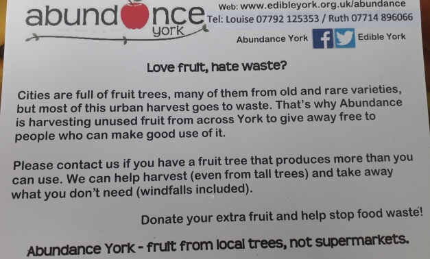 – please join us and help harvesting – tell your friends! We rely on volunteers to pick, sort and deliver fruit (mainly apples) across York.